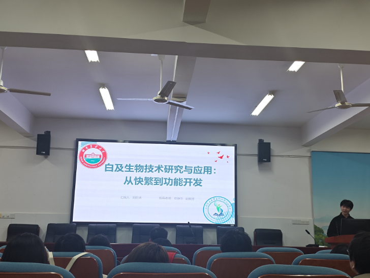 最后,3044am永利集团官网胡钧涛同学以“白及生物技术研究与应用”为主题展开分享。他从白及的药用价值与产业现状切入,详细解读了分子标记辅助育种、组培苗快繁等核心生物技术如何破解传统种植难题,大大缩短了白及育苗周期,减缓了野生资源的压力。结合物联网智能种植、低温破壁提取等前沿技术案例,胡钧涛重点分析了白及多糖在医药创伤修复等领域的多元应用,展现了这一珍稀药材从种植到深加工的全产业链价值,其数据化的产业分析与前瞻性的技术展望让在场听众深受启发。